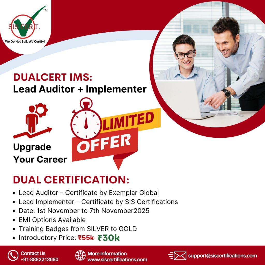 DualCert IMS: Lead Auditor & Implementer Training | ISO 9001, ISO 14001, ISO 45001 | 15th, 16th, 17th, 18th, 19th, 20th, 21th Dec 2025 | Remote & Onsite | Planned | Apply Now for Registration |