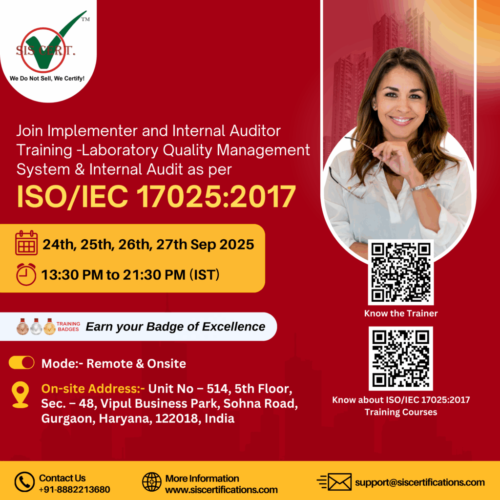Implementer and Internal Auditor Training | Laboratory Quality Management System & Internal Audit as per ISO/IEC 17025:2017 Know More | 24th, 25th, 26th, 27th Sep 2025 13:30 PM to 21:30 PM (IST) | Remote & Onsite | Reschedule | Apply Now for Registration |