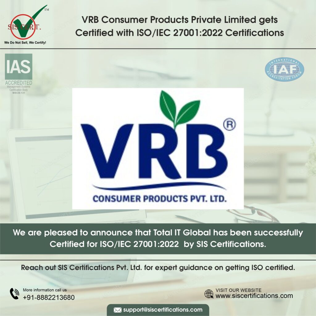 VRB Consumer Products Private Limited achieves ISO/IEC 27001:2022 Certification VRB Consumer Products Private Limited received ISO/IEC 27001:2022 Certification for Information Security, Cybersecurity and Privacy Protection — Information Security Management System (ISMS). Achieving ISO/IEC 27001 Certification ensures that the organisation adopts appropriate controls for data privacy and information security. About VRB Consumer Products Private Limited VRB combines the seasoned expertise of a seasoned manufacturing company with the agility and spark of a young start-up. This blend enables the brand to create products with genuine value and purpose. The company produces and markets a wide range of food and beverage items across global markets, from condiments and sauces to syrups and beverages, proudly represented through five trusted brands. Scope of Certification The scope of the management system includes Isms Implementation for Manufacturing, Marketing and Sale of Sauces & Condiments Including Mayonnaise, Dressings, Ketchup, Spreads, Dips, Sweet Toppings, Gravies, and Drink Mixes, Bakery Ingredients, Seasonings, Marmalades and Noodles. Why ISO/IEC 27001:2022 Matters in Manufacturing? ISO/IEC 27001:2022 is relevant to manufacturing because the industry now relies on data as much as on machinery. Every stage depends on secure information flow, from production lines to supplier networks. A single cyber incident can halt operations, leak sensitive information, erode customer trust, and incur significant downtime costs. The 2022 version addresses modern threats such as cloud systems, remote access, automation, and IoT-heavy environments, making it essential for future-ready manufacturers. Organisations strengthen resilience and protect intellectual property to ensure regulatory compliance and keep operations running without nasty surprises Key Benefits of ISO/IEC 27001:2022 for VRB Consumer Products Private Limited ISO/IEC 27001:2022 helps VRB Consumer Products Private Limited Safeguard VRB’s formulations, Research and Development insights, and brand assets from cyber theft or misuse.  ISO/IEC 27001 ensures uninterrupted production within VRB Consumer Products Private Limited by protecting systems, partner data, and digital workflows from cyber threats.  ISO/IEC 27001 supports smoother entry into international markets where data security compliance is a prerequisite.  ISO/IEC 27001 for ISMS prevents costly downtime for VRB Consumer Products Private Limited due to cyber incidents by implementing robust preventive and response controls. Looking Ahead: Building a Safe and Sustainable Future VRB Consumer Products Private Limited is steadily progressing toward additional certifications to strengthen its global footprint and operational excellence, including: ISO/IEC 20000-1:2018 – IT Service Management: To optimize IT service delivery frameworks. ISO/IEC 27701:2025 – Information Security, Cybersecurity and Privacy Protection — Privacy Information Management System ISO 22000:2018 – Food Safety Management System Celebrating a Moment of Shared Success Achieving ISO/IEC 27001 with SIS Certifications reflects VRB Consumer Products Private Limited’s collective effort by showcasing its dedication to operational excellence and workplace well-being. At SIS Certifications, we are proud to have partnered with ICWA Sapru House Library in this milestone. Their story is a shining example of how passion, precision, and process can combine to create not only stunning products but also long-lasting customer trust. Share the Post: Related Posts