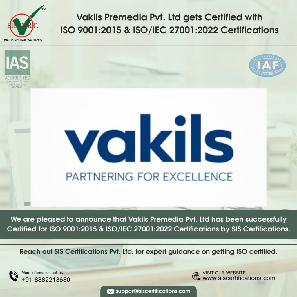 Vakils Premedia Pvt. Ltd. achieves ISO 9001 & 27001 Certifications Vakils Premedia Pvt. Ltd. has successfully completed Surveillance 01 for IAS-accredited ISO 9001:2015 and ISO/IEC 27001:2022 certifications, reinforcing its commitment to quality excellence and robust information security practices. These certifications demonstrate the organisation’s structured approach to delivering consistent quality while safeguarding information assets across its operations. Achieving ISO 9001:2015 Quality Management System (QMS) certification confirms that Vakils Premedia has established process-driven controls to enhance service quality, streamline workflows, manage risks effectively, and drive continual improvement. It ensures that customer requirements, regulatory obligations, and internal quality benchmarks are met—not by chance, but by design. In parallel, ISO/IEC 27001:2022 Information Security Management System (ISMS) certification validates the organisation’s ability to identify, manage, and mitigate information security risks. The standard ensures appropriate controls are in place to protect data confidentiality, integrity, and availability across digital platforms, client interfaces, and business-critical systems. About Vakils Premedia Pvt Ltd We are a company with deep roots, dating back to 1946, with the establishment of our parent company, Vakil & Sons. The entrepreneurial and forward-thinking mindset of Vakil & Sons transformed and improved the designing and printing industry in India. Carrying forward this legacy of innovation and adaptability, Vakils Premedia was formally incorporated in 2004. Today, Vakils Premedia delivers specialised pre-media and digital services designed to meet the evolving demands of modern marketing. We provide powerful solutions with flawless execution to unlock productivity and efficiency within our clients’ marketing communication operations. We continue to partner with our clients, enabling them to achieve high levels of performance by allowing them to focus on their core business. Scope of Certification The scope of the management systems includes Applying Quality Management and Information Security System (IMS) to Premedia and ePublishing Services, Web & Apps Solutions, Packaging Artwork and its related Regulatory Solutions. This also includes Support processes such as HR, Administration, Sales and IT. Why ISO 9001 & ISO/IEC 27001 Matter for Publishing & Premedia In the publishing ecosystem, quality lapses damage credibility, while data breaches destroy trust. ISO 9001:2015 ensures consistency, accuracy, and efficiency in content-related processes. ISO/IEC 27001:2022 addresses modern risks tied to digital publishing, cloud-based workflows, remote collaboration, and sensitive intellectual property. Together, these standards create a disciplined operational backbone where quality is repeatable and information security is proactive, not reactive. Key Benefits for Vakils Premedia Pvt. Ltd – Ensures consistent service quality through standardized, auditable processes.  Protects client data, manuscripts, and intellectual property from unauthorized access or misuse.  Reduces operational errors, rework, and process inefficiencies.  Strengthens client confidence, especially with global publishers demanding strict compliance.  Improves risk management, business continuity, and regulatory alignment. Looking Ahead With ISO 9001:2015 and ISO/IEC 27001:2022 in place, Vakils Premedia Pvt. Ltd. is well-positioned to scale operations responsibly, strengthen global partnerships, and adapt to the evolving digital publishing landscape—without compromising on quality or security. Celebrating a Moment of Shared Success SIS Certifications is known for its transparent, impartial, and rigorous audit methodology. Our audit team observed Vakils Premedia Pvt. Ltd.’s strong process orientation, disciplined documentation practices, and leadership commitment to quality and information security. Achieving dual certifications with SIS Certifications reflects Vakils Premedia Pvt. Ltd.’s collective focus on operational excellence, customer trust, and long-term sustainability. Share the Post: Related Posts