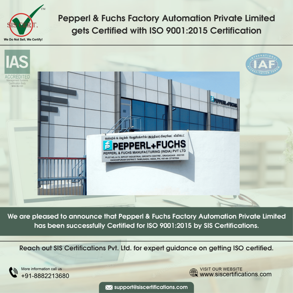 Pepperl & Fuchs Factory Automation Private Limited Strengthens with ISO 9001:2015 Certification Pepperl & Fuchs Factory Automation Private Limited has successfully completed Surveillance 02 for IAS-accredited ISO 9001:2015 certification, reinforcing its commitment to excellence in quality. The accreditation demonstrates the organisation’s structured approach to delivering consistent quality while ensuring optimum resource utilisation. Achieving ISO 9001:2015 Quality Management System (QMS) certification confirms that Pepperl & Fuchs Factory Automation Private Limited has established process-driven controls to enhance service quality, streamline workflows, manage risks effectively, and drive continual improvement. Scope of Certification The scope of the management systems includes Sales of Industrial Electronic Components and Systems as Supplied by Pepperl+Fuchs SE Germany & Its Worldwide Facilities. Why ISO 9001 Matters for Pepperl & Fuchs Factory Automation Private Limited? ISO 9001 matters for Pepperl & Fuchs because selling industrial electronic components and systems across global markets leaves zero room for inconsistency, delays, or quality slips. The standard enhances Pepperl & Fuchs’ reputation as a dependable technology partner by embedding a customer-focused approach, risk-based thinking, and operational excellence into daily operations. Key Benefits for Pepperl & Fuchs Factory Automation Private Limited Delivers consistent service outcomes by implementing clearly defined and auditable workflows Minimises operational errors, rework, and inefficiencies through process control Builds stronger client trust, particularly with global publishers that expect uncompromising compliance Enhances risk control, business continuity, and alignment with regulatory requirements  Looking Ahead With ISO 9001:2015, Pepperl & Fuchs Factory Automation Private Limited is well-positioned to scale operations responsibly, strengthen global partnerships, and adapt to the evolving digital publishing landscape without compromising on quality. About SIS Certifications SIS Certifications is recognised for its impartial, transparent, and robust audit approach. We are one of the most trusted ISO certification bodies. Our journey started in 2010 and since then we have grown to cater more than 15,000 clients across more than 55 countries. We are accredited by both International Accreditation Services (IAS-IAF) and United Accreditation Foundation (UAF). Share the Post: Related Posts