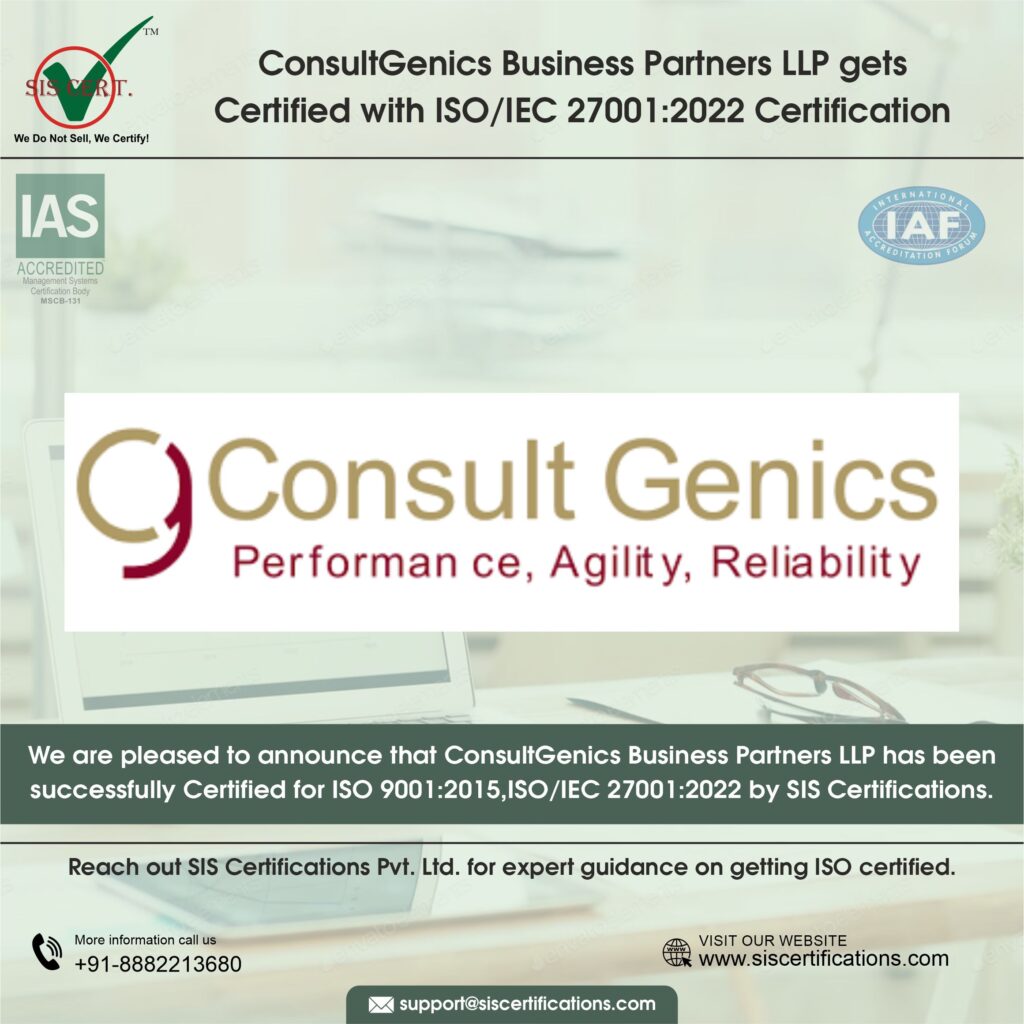ConsultGenics Business Partners LLP Achieves ISO/IEC 27001:2022 Certification – Elevating Data Security & Business Excellence We’re delighted to announce ConsultGenics Business Partners LLP has been officially recommended for the continuation of the ISO/IEC 27001:2022 certification, a globally respected benchmark for Information Security Management System (ISMS). This milestone underscores ConsultGenics’ unwavering commitment to safeguarding information, streamlining operations, and building trust with clients through reliable, secure, and forward-looking consulting services. About ConsultGenics Business Partners LLP ConsultGenics is a forward-thinking firm delivering high-impact solutions in financial advisory, strategy consulting, business research, process consulting & PMO, and data analytics. With a sharp eye on innovation and value-driven results, the firm has quickly become a trusted partner to businesses across various industries. Their reputation is built on a foundation of confidentiality, strategic insight, and a customer-first approach. The ISO/IEC 27001:2022 certification now reinforces this commitment—offering their clients added assurance that data integrity and security are at the heart of every project. Scope of Certification The certification applies to the scope: “Provision of Financial Advisory, Strategy Consulting & Business Research, Process Consulting & PMO, and Data Analytics.” Statement of Applicability (SOA) Details: Document: CG_ISMS_A_SOA Version: 2.0 Date: 12.02.2025 This clearly defined scope reflects ConsultGenics’ proactive stance in protecting information across all its operational domains. Why ISO/IEC 27001:2022 is a Game-Changer for Information Security ISO/IEC 27001:2022 is the world’s leading standard for establishing, maintaining, and continuously improving an effective information security management system. For a company like ConsultGenics that handles sensitive financial data, strategic insights, and proprietary client information, this certification is more than a formal achievement—it’s a declaration of trust and accountability. By implementing a robust framework of security controls and risk management processes, ConsultGenics is ensuring that confidentiality, integrity, and availability of information are never compromised. Key Benefits of ISO/IEC 27001:2022 for ConsultGenics Enhanced Data Protection – With advanced information security controls in place, client data and internal resources are safeguarded from breaches and unauthorized access. Boosted Client Confidence – Clients can now engage with ConsultGenics knowing that stringent international standards govern every touchpoint of their engagement. Operational Resilience – Risk assessments, mitigation strategies, and incident response mechanisms are now deeply embedded within the company’s operations, enabling swift response to evolving threats. Competitive Edge – Certification gives ConsultGenics a distinct advantage in the marketplace, especially among enterprises and institutions that prioritize secure collaboration. Stronger Internal Governance – A culture of security awareness and compliance is cultivated across teams, ensuring everyone understands and embraces their role in safeguarding information. Global Credibility – The recognition opens doors for new opportunities and partnerships across the world, solidifying ConsultGenics’ standing as a trusted advisor in a data-sensitive world. A Vision for Secure and Sustainable Growth While earning the ISO/IEC 27001:2022 certification is a remarkable achievement, it’s only the beginning of an even more secure and streamlined future for ConsultGenics. The leadership team remains firmly committed to continuous improvement—looking for ways to enhance systems, strengthen compliance, and foster a culture that places a high value on information security. In the long term, ConsultGenics is also exploring other international certifications that could further fortify their operational excellence, such as: ISO 22301 – Business Continuity Management: To ensure seamless service delivery during disruptions. ISO 31000 – Risk Management: For deeper integration of risk analysis into decision-making. ISO 20000 -1 – IT Service Management: To improve quality and efficiency of IT services supporting client engagements. Certification by SIS Certifications – A Mark of Trust The certification audit was conducted by SIS Certifications, a globally respected certification body known for its meticulous and transparent auditing process. SIS Certifications is proud to be associated with ConsultGenics in this journey, recognizing their thorough approach to compliance, risk management, and governance. Share the Post: Related Posts