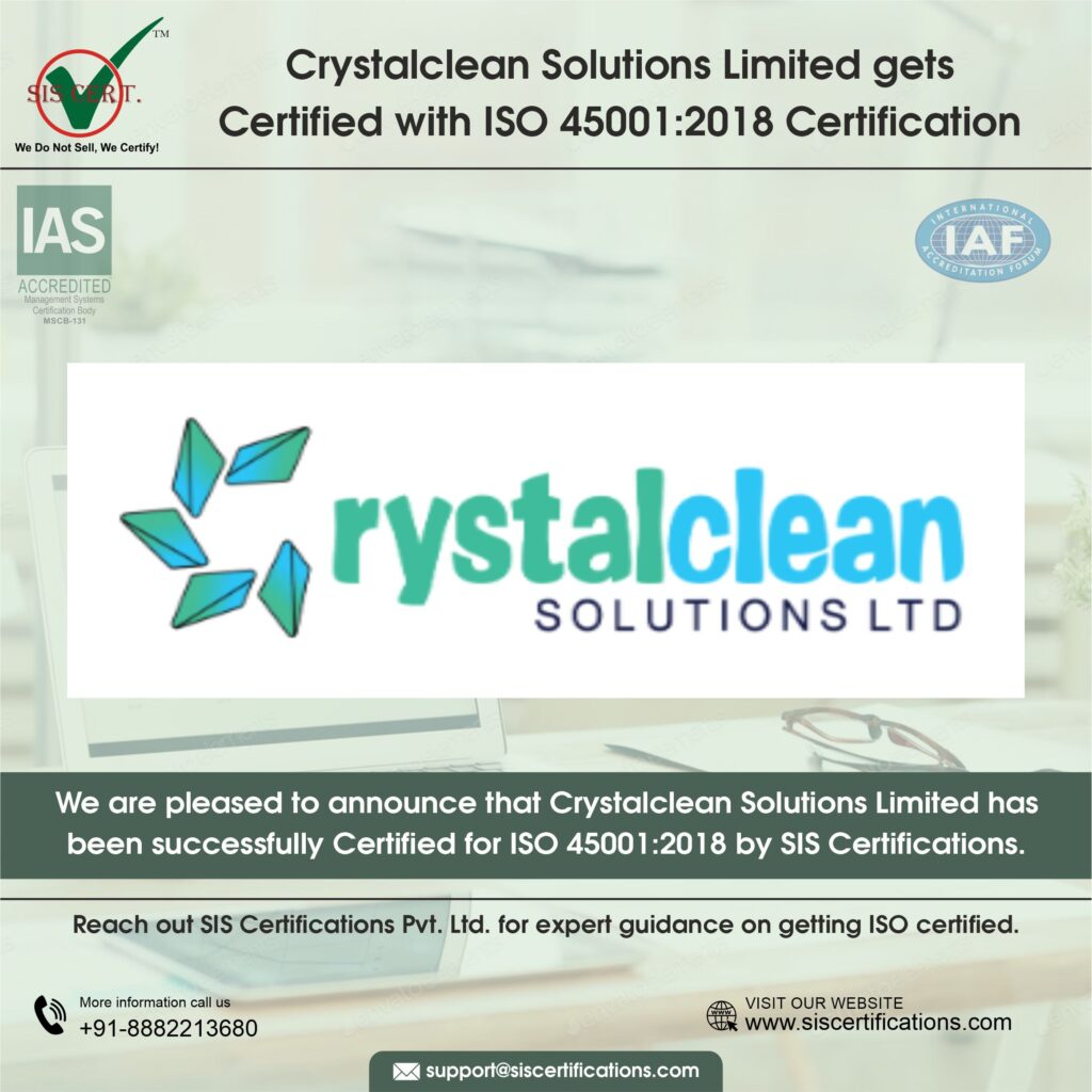 Crystalclean Solutions Limited Achieves ISO 45001:2018 Certification – Elevating Workplace Safety Across the Service Industry We’re excited to announce that Crystalclean Solutions Limited has completed the initial audot for ISO 45001:2018 certification—a globally recognized standard for Occupational Health and Safety Management System (OHSMS). This remarkable milestone highlights the company’s unwavering commitment to safeguarding its workforce and delivering exceptional service with safety at the core. At a time when health, safety, and environmental responsibility are more important than ever, Crystalclean is raising the bar across the cleaning and facility management industry by embedding world-class safety practices into every layer of its operations. About Crystalclean Solutions Limited Crystalclean Solutions Limited is a trusted name in the world of professional cleaning, pest control, facility management, and environmental hygiene. With a client-centric mindset and a passion for perfection, the company provides reliable, high-impact services across residential, commercial, industrial, and construction environments. Whether it’s keeping office towers spotless, controlling pests in warehouses, refreshing hotel air spaces, or maintaining beautiful gardens, Crystalclean combines skilled personnel with advanced tools to deliver top-tier outcomes every time. Scope of Certification Crystalclean’s ISO 45001:2018 certification proudly covers the following: “Provision of Cleaning Services, Including Residential, Commercial, Construction Site, Industrial, and Facility Management Cleaning; Fumigation and Pest Control; Gardening Services; Air Freshening Services; and the Supply of Equipment and Cleaning Consumables.” Why ISO 45001:2018 Is a Strategic Win for Service-Based Companies ISO 45001:2018 isn’t just about compliance—it’s about proactive safety leadership. For a company like Crystalclean, which operates in diverse and sometimes high-risk environments, having a certified OHSMS means anticipating hazards, reducing risks, and protecting both staff and clients. The certification brings structure and discipline to safety efforts, turning policies into everyday habits and helping the company build a resilient, people-first culture. Key Benefits of ISO 45001:2018 for Crystalclean Solutions A Safer Workforce – Every cleaner, technician, gardener, and logistics team member now works within a clearly defined safety system designed to reduce injuries and health hazards. Improved Operational Efficiency – Fewer incidents mean smoother workflows, less downtime, and greater productivity across all service categories. Stronger Client Trust – Clients can rely on Crystalclean to deliver services responsibly, knowing that safety standards are baked into every job. Legal and Regulatory Compliance – With clear documentation and risk assessments in place, Crystalclean meets (and often exceeds) legal obligations related to workplace health and safety. Empowered Employees – Workers receive safety training, protective gear, and clear procedures, giving them the confidence and tools they need to work securely. Reputation for Responsibility – In today’s business climate, safety-conscious companies stand out. This certification positions Crystalclean as a preferred partner for high-profile contracts and long-term collaborations. Looking Ahead: Safety That Scales with Growth Securing the ISO 45001:2018 certification is more than a badge of honor—it’s a bold declaration of intent. As Crystalclean Solutions continues to expand its reach and diversify its offerings, it’s also deepening its investment in people-first policies, safety innovations, and continuous improvement. The company is exploring additional ISO certifications to further enhance its systems: ISO 9001 – Quality Management System: To ensure every job is delivered with precision and consistency. ISO 14001 :2015– Environmental Management System: To align with global best practices for sustainable, eco-friendly operations. With these in sight, Crystalclean is not just cleaning spaces—it’s redefining how service companies care for their people, clients, and the planet. SIS Certifications – Trusted Partners in Excellence The audit process was conducted by SIS Certifications, a globally accredited body known for its impartial evaluations and high standards. The team at Crystalclean showcased professionalism, preparedness, and an outstanding commitment to embedding the ISO 45001:2018 framework into their operations. The certification not only confirms compliance but also highlights Crystalclean’s proactive stance on creating a safe, structured, and performance-driven work culture. Celebrating a Culture of Care and Commitment This accomplishment is a collective victory—one earned through the dedication of every department and individual at Crystalclean Solutions. From top leadership to on-ground teams, everyone played a role in creating an environment where safety is not just a policy, but a shared value. Congratulations, Crystalclean Solutions Limited! You’ve proven that care, commitment, and certification go hand-in-hand in building a better, safer future for all. Share the Post: Related Posts