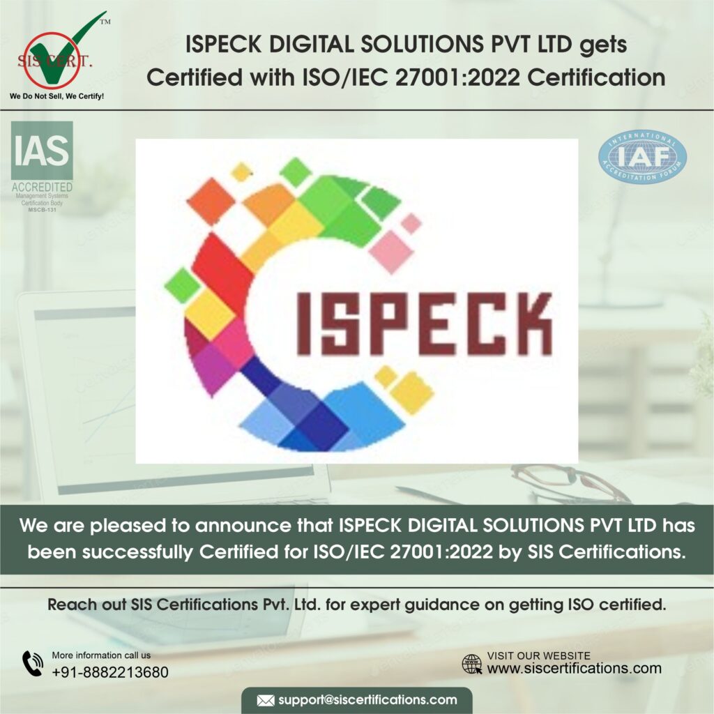 ISPECK Digital Solutions Pvt. Ltd. Secures ISO/IEC 27001:2022 Certification At SIS Certifications, we are thrilled to announce that ISPECK Digital Solutions Pvt. Ltd. has achieved the coveted ISO/IEC 27001:2022 certification, a globally respected standard for Information Security Management System (ISMS). This milestone reflects ISPECK’s unwavering dedication to protecting information assets, building trust, and operating with the highest levels of data integrity, transparency, and accountability in a digital-first world. About ISPECK Digital Solutions Pvt. Ltd. ISPECK Digital Solutions Pvt. Ltd. is a cutting-edge technology firm offering custom software development, AI/ML solutions, computer vision, natural language processing, data analytics, and software data management services. With a strong focus on digital transformation and innovation, ISPECK is known for turning complex data challenges into streamlined, secure, and scalable solutions. Scope of Certification The ISO/IEC 27001:2022 certification granted to ISPECK covers the following scope: “Custom Software Development, Deep AI/ML and Computer Vision, NLP, Data Analytics, Software Data Management and Digitization Initiatives.” Why ISO/IEC 27001:2022 Matters Today In an era where data breaches and cyber threats are rising rapidly, ISO/IEC 27001:2022 sets the gold standard for organizations aiming to protect sensitive information. This standard provides a structured framework to identify, assess, and manage information security risks, ensuring that data — whether digital or physical — remains safe from misuse, leaks, or unauthorized access. For ISPECK, this certification is far more than a compliance checklist. It’s a strategic and ethical commitment to clients, partners, and stakeholders that their data is in secure, capable hands. Key Benefits of ISO/IEC 27001:2022 for ISPECK Digital Solutions Robust Data Protection – By aligning with ISO/IEC 27001:2022, ISPECK has implemented comprehensive data security controls, shielding client and internal information from cyber threats and vulnerabilities. Client Confidence and Trust – With growing concerns about data misuse, this certification assures clients that their digital assets and intellectual property are handled with utmost care, precision, and protection. Global Recognition – Achieving ISO/IEC 27001:2022 elevates ISPECK’s international profile, validating its world-class standards in information management and technological governance. Improved Operational Discipline – The firm’s internal security protocols, risk assessments, and access controls have been refined and reinforced, making daily operations more secure and accountable. Competitive Edge in Tech Landscape – In a highly competitive digital ecosystem, this certification gives ISPECK a strategic advantage, especially when dealing with data-sensitive sectors like fintech, healthcare, and government-led digitization initiatives. Culture of Responsibility and Vigilance – ISO/IEC 27001:2022 isn’t just about technology — it promotes a culture where every team member values and upholds data integrity and confidentiality in their day-to-day decisions. Looking Ahead: From Compliance to Continuous Innovation Securing ISO/IEC 27001:2022 is a pivotal moment in ISPECK’s growth journey—but it’s just the beginning. The company is already working on enhancing its digital infrastructure, AI capabilities, and secure data platforms. By integrating emerging technologies with solid information security foundations, ISPECK aims to redefine the future of responsible AI and software innovation. In addition, the company is planning to pursue other high-impact certifications to further deepen its focus on quality and compliance, including: ISO 9001:2015 – Quality Management System: To ensure consistent service excellence and client satisfaction. ISO 37001:2025 – Anti-Bribery Management System: To embed ethical governance across operations. ISO 22301:2019 – Business Continuity Management System: To strengthen disaster recovery and operational resilience. Setting the Bar High in Information Security The ISO/IEC 27001:2022 audit for ISPECK was carried out by SIS Certifications, a globally trusted certification body known for its rigorous evaluation processes and commitment to integrity. The successful audit process speaks volumes about ISPECK’s structured approach to cybersecurity, risk mitigation, and digital governance. This certification is not just a formality — it’s a statement. It tells the world that ISPECK stands for ethical innovation, security-first thinking, and client-centric excellence. A Moment of Pride for All At SIS Certifications, we’re incredibly proud to have guided ISPECK Digital Solutions Pvt. Ltd. through this important transformation. Their team has shown extraordinary commitment and discipline in aligning their operations with ISO/IEC 27001:2022 standards. We wholeheartedly congratulate ISPECK on this outstanding achievement. With this milestone, the company not only protects what matters most but also raises the bar for the entire digital industry. Share the Post: Related Posts