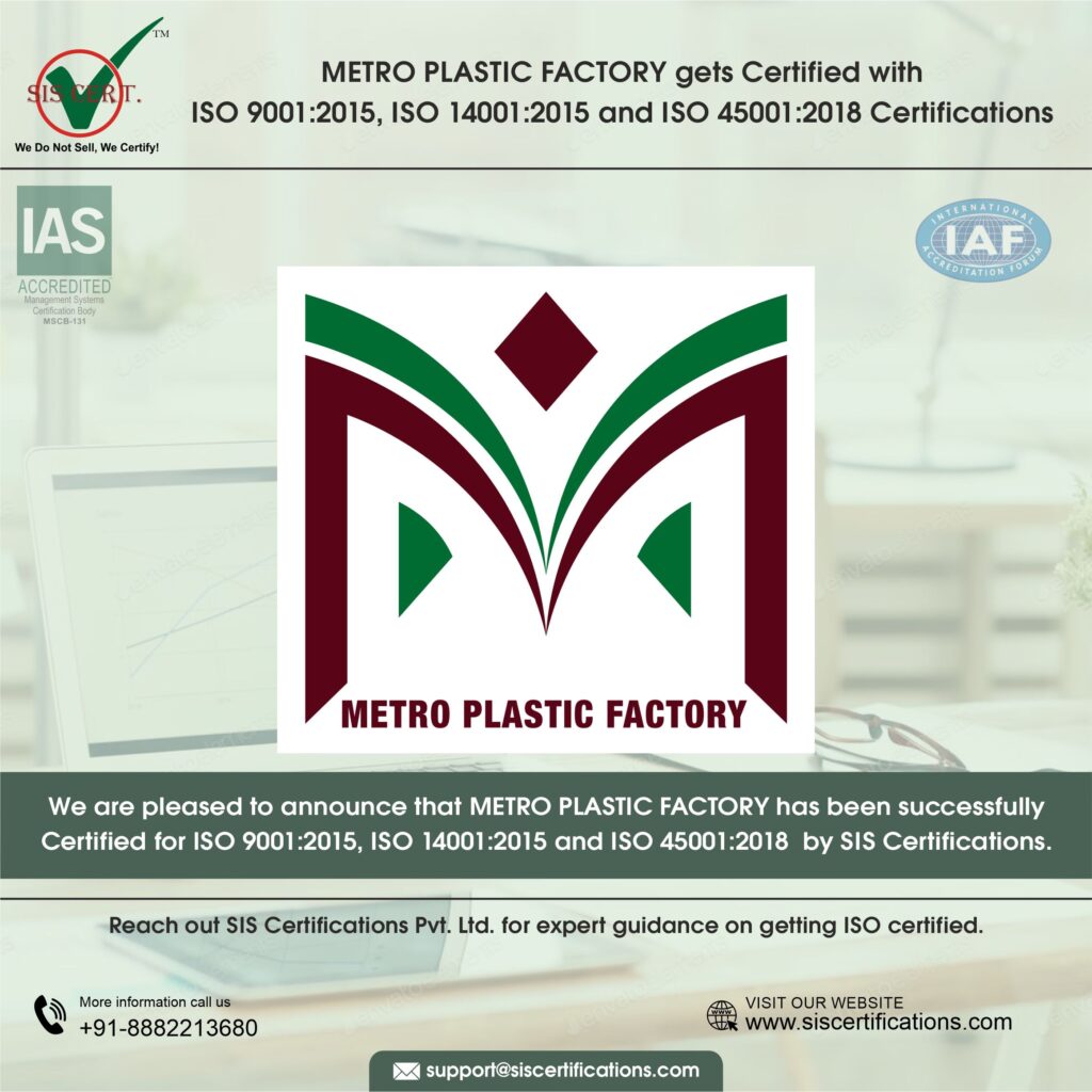Metro Plastic Factory Achieves Triple ISO Certification – A Landmark in Quality, Sustainability, and Workplace Safety It gives immense pleasure to congratulate and announce that Metro Plastic Factory has been successfully recommended for continuation of certificate for ISO 9001:2015, ISO 14001:2015, and ISO 45001:2018 certifications—recognizing the company’s strong systems in Quality Management, Environmental Responsibility, and Occupational Health & Safety. This exceptional milestone marks a major step forward in the company’s journey of continuous growth, responsible manufacturing, and putting people and the planet first. With this achievement, Metro Plastic Factory stands tall as a leading force in the plastic manufacturing industry, committed to delivering top-notch products while upholding the highest global standards. About Metro Plastic Factory Metro Plastic Factory is a dynamic and fast-growing manufacturer of elastic and plastic products that serve multiple sectors including agriculture, utilities, and packaging. The company produces a range of essential everyday items such as vegetable plastic boxes, agricultural irrigation pipes, black buckets, and drinking water pipes. Scope of Certification The triple ISO certifications were awarded for the following scope: “Manufacture of Elastic and Plastic Products, Producing Vegetables Plastic Boxes, Agricultural Irrigation Pipes, Black Buckets and Drinking Water Pipes.” Why These ISO Certifications Are So Important In today’s fast-paced and quality-conscious market, achieving ISO 9001:2015, ISO 14001:2015, and ISO 45001:2018 isn’t just an accomplishment—it’s a strategic advantage. These certifications demonstrate that Metro Plastic Factory is committed to doing business the right way: with quality at the core, environmental care in every process, and a safe, empowered workforce behind it all.  ISO 9001:2015 – Quality Management System: Ensures consistent product quality, improved processes, and a customer-focused approach.  ISO 14001:2015 – Environmental Management System: Drives sustainability, responsible resource use, and reduced environmental impact.  ISO 45001:2018 – Occupational Health & Safety Management System: Protects employees, promotes a safety-first culture, and reduces workplace risks.  Key Benefits of Triple ISO Certification for Metro Plastic Factory End-to-End Quality Assurance – With ISO 9001 in place, every product—be it a plastic box or a water pipe—is made following strict quality protocols that guarantee reliability and performance. Commitment to Sustainability – Thanks to ISO 14001, the company minimizes waste, optimizes resource use, and actively works to reduce its carbon footprint—making manufacturing cleaner and greener. Safer Workplaces – ISO 45001 reinforces a culture where employee safety is non-negotiable. Workers now operate with improved awareness, proper training, and strong safety systems. Increased Customer Trust – Clients are more confident doing business with a company that meets internationally recognized standards. Metro Plastic Factory stands out as a responsible, transparent, and dependable supplier. Higher Efficiency and Lower Costs – Refined processes, reduced rework, and better resource planning mean leaner operations and faster turnaround times, improving profitability. Market Expansion Opportunities – These certifications help the company enter new domestic and international markets, where such credentials are often essential for high-value contracts. Culture of Continuous Improvement – Everyone at Metro Plastic Factory is now encouraged to look for smarter, safer, and more efficient ways to work—driving a culture of innovation and progress. Looking Forward: Building a Smarter, Safer Future Achieving triple ISO certification is a remarkable moment, but at Metro Plastic Factory, it’s seen as just the beginning. The company is already taking steps to integrate automation, explore eco-friendly raw materials, and design next-gen plastic solutions that align with future market needs. The leadership team is deeply invested in sustainable manufacturing, ethical labor practices, and global expansion—setting bold goals for the years ahead while staying grounded in values of quality and integrity. SIS Certifications – Our Trusted Partner on the Journey The audit and certification process was conducted by SIS Certifications, a globally accredited and respected body known for its rigorous evaluations and world-class standards. The audit team commended Metro Plastic Factory’s preparedness, operational discipline, and commitment to embedding quality, sustainability, and safety into the heart of its manufacturing process. This certification is a strong endorsement of Metro’s vision, leadership, and on-ground execution—proving that excellence is not an event, but a way of doing business every day. A Moment to Celebrate At SIS Certifications, we are proud to have supported Metro Plastic Factory through this significant achievement. This success is a reflection of the collective effort, passion, and dedication of every team member—from machine operators to senior leadership—who believed in a better way to manufacture. Congratulations to Metro Plastic Factory on earning ISO 9001:2015, ISO 14001:2015, and ISO 45001:2018 certifications! May this triple recognition serve as a launchpad for continued growth, innovation, and leadership in plastic manufacturing. Share the Post: Related Posts