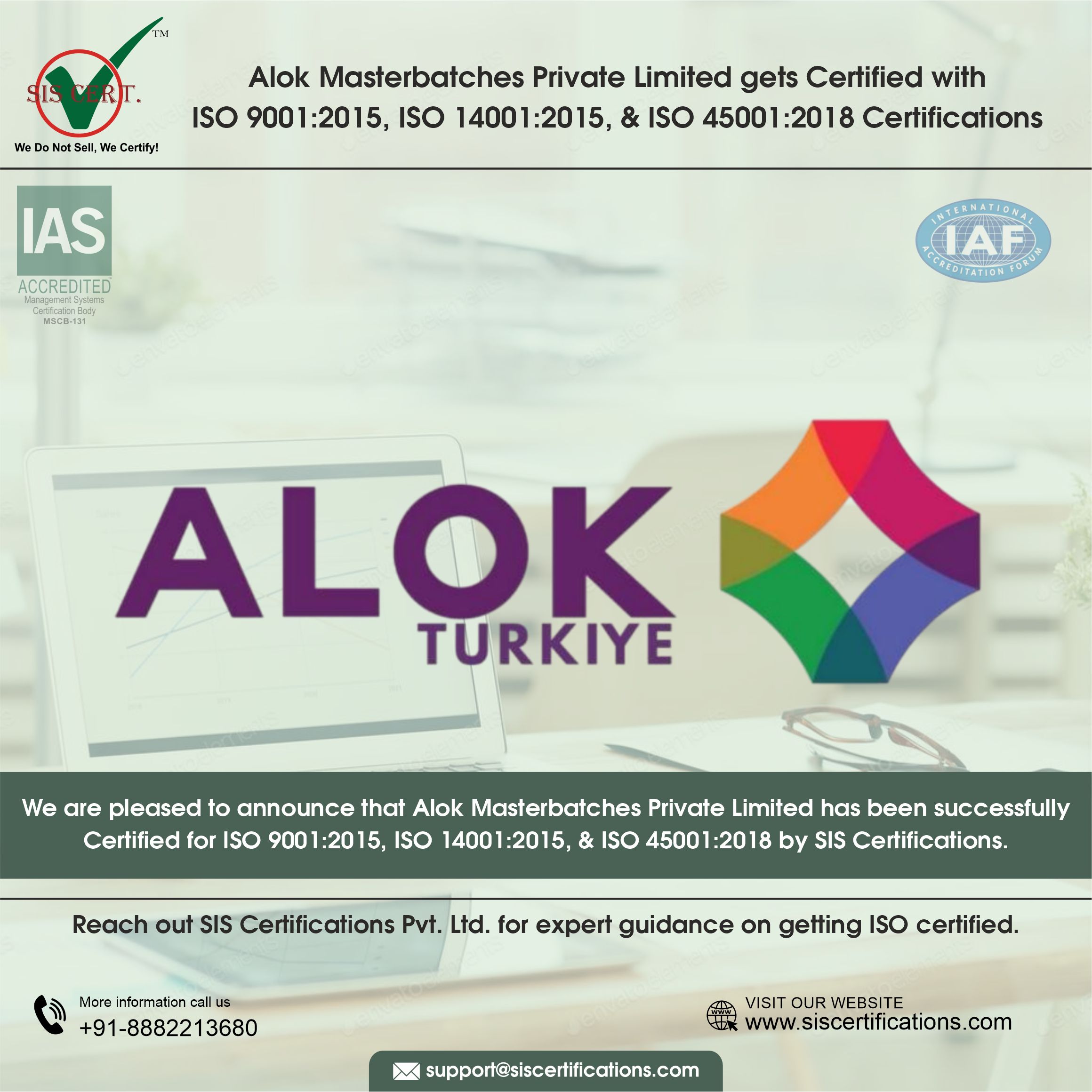 Warmest congratulations to Alok Masterbatches Private Limited for successfully achieving IAS-accredited ISO 9001:2015, ISO 14001:2015, and ISO 45001:2018 certifications.