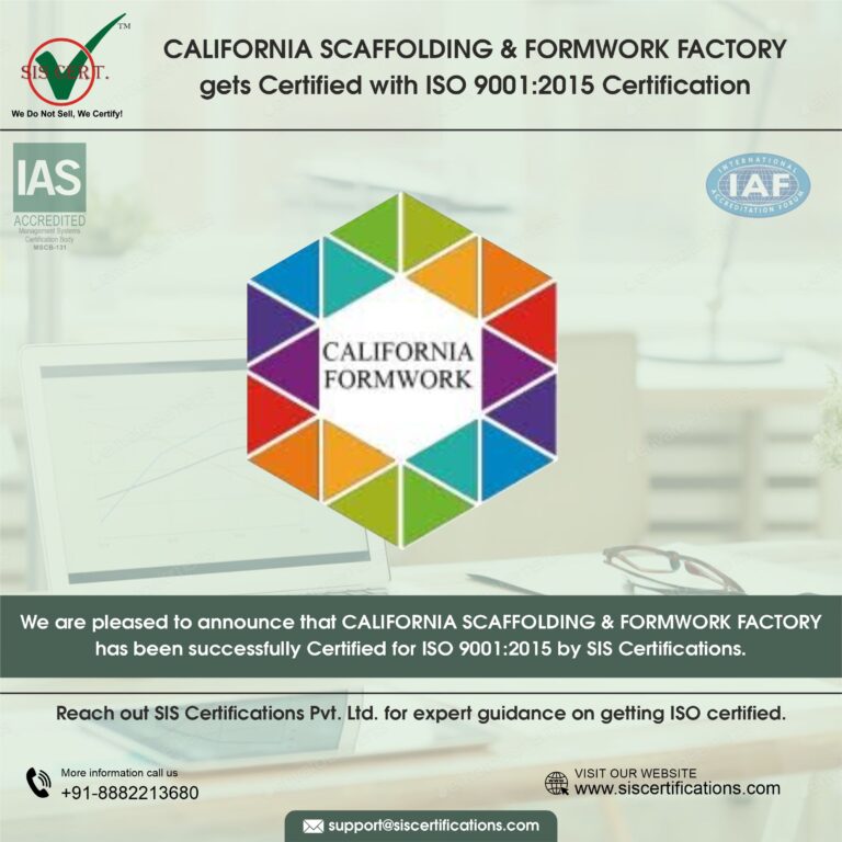 California Scaffolding & Formwork Factory, a leading manufacturing company for construction solutions, has completed its ISO 9001:2015 Surveillance 02 Audit conducted by IAS-accredited SIS Certifications. This accomplishment highlights California Scaffolding & Formwork Factory’s disciplined Quality Management System implementation and sustained commitment to quality management, customer focus on customer-focused.
