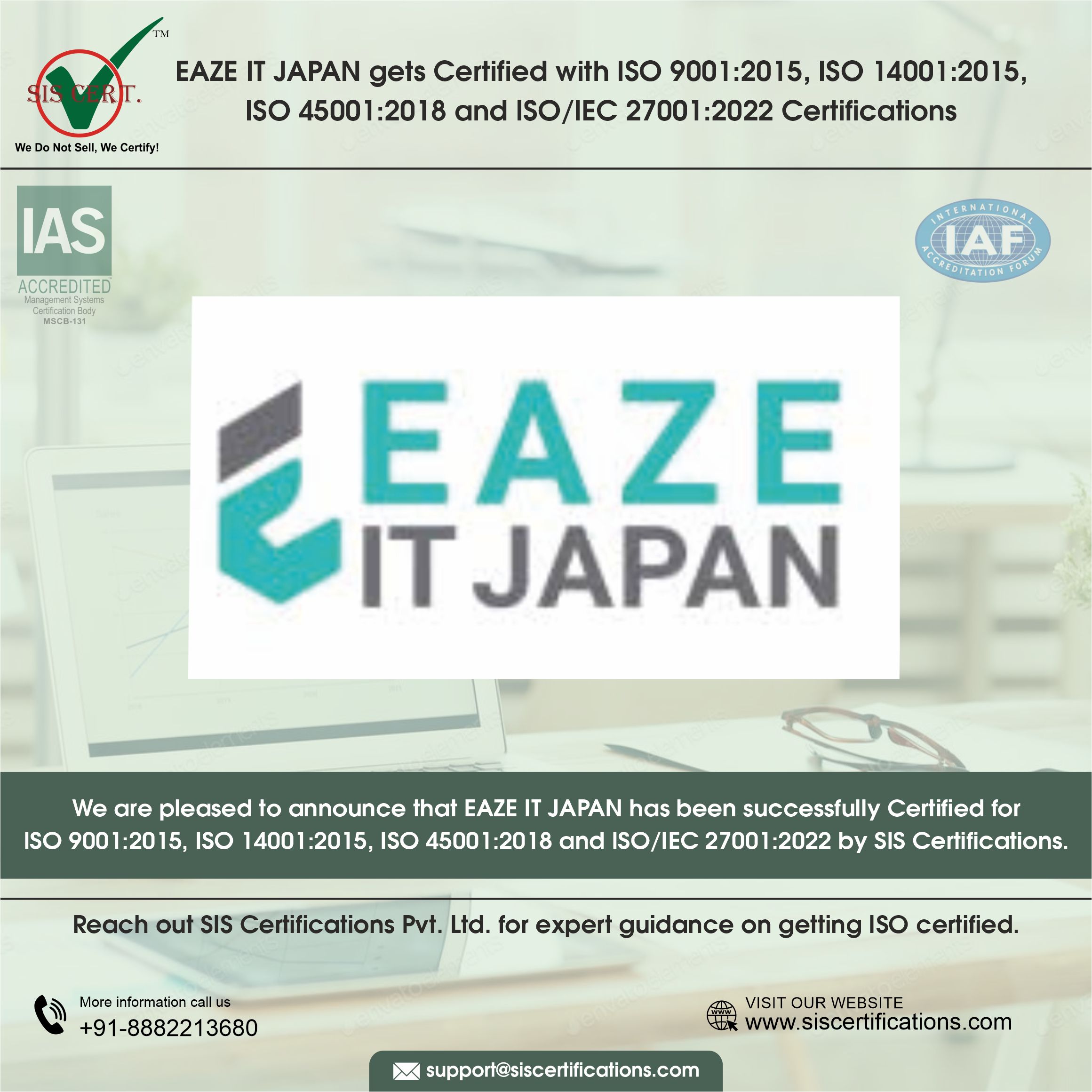 Warmest congratulations to EAZE IT JAPAN for successfully achieving IAS-accredited ISO 9001:2015, ISO 14001:2015, ISO 45001:2018, and ISO 27001:2022 certifications, demonstrating its strong commitment to quality, environmental responsibility, occupational health & safety, and information security.