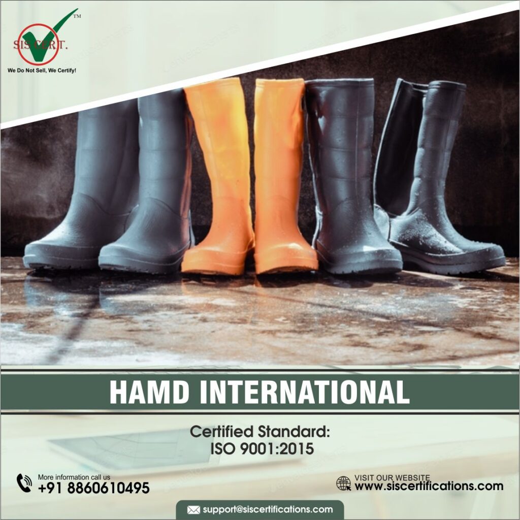 SIS CERTIFICATIONS, which certified the “HAMD INTERNATIONAL” for their manufacturing and supply and exports of PVC and PU moulding safety shoes, is accredited by both International Accreditation Services (IAS-IAF) and International Organization for Accreditation Services (IOAS).Several certifications, including and not limited to ISO 9001, ISO 14001, ISO 22301, ISO 21001, ISO 37001, ISO 41001, ISO 45001, ISO 50001, ISO 13485, ISO 22000, HACCP, ISO 27001, IATF 16949, CE, RoHS, KOSHER, HALAL, Product Certifications, and training comes under the aegis of its services.