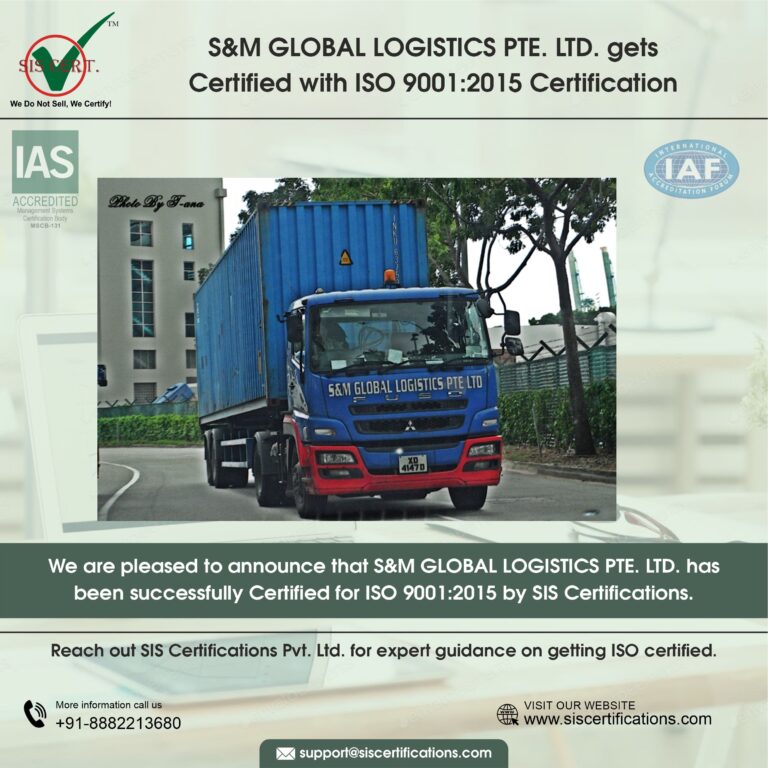 The certification audit was conducted by SIS Certifications, a leading and internationally accredited body known for its comprehensive evaluation process and commitment to excellence. The SIS audit team was impressed by S & M Global Logistics’ well-structured processes, transparent documentation, and company-wide engagement throughout the certification journey.